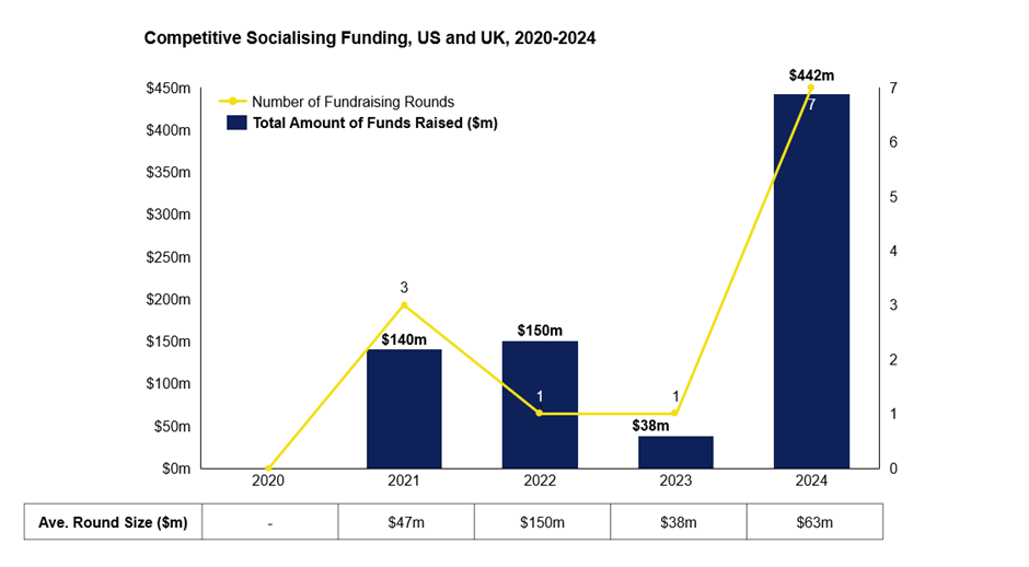 At the crossroads of these trends sits the competitive socialising market, which between 2021 and 2024, exploded with a near fourfold growth. Industry leaders like F1 Arcade and TOCA Social have secured ~$40m and $130m for US and worldwide expansion respectively, while the Jolliffe twins, who had begun the world-leading competitive socialising business TopGolf, have just invested $15m into their latest venture. They are launcing Poolhouse, an interactive, digitalised and AI-enhanced, in-person pool experience integrated with the warmth of a pub and state-of-the-art digital technology that customises the difficulty of the game depending on level of experience. In the US and UK alone, $1.2 billion that has been invested into tech-enabled competitive socialising, and $770 million of which was committed within the last 5 years.
