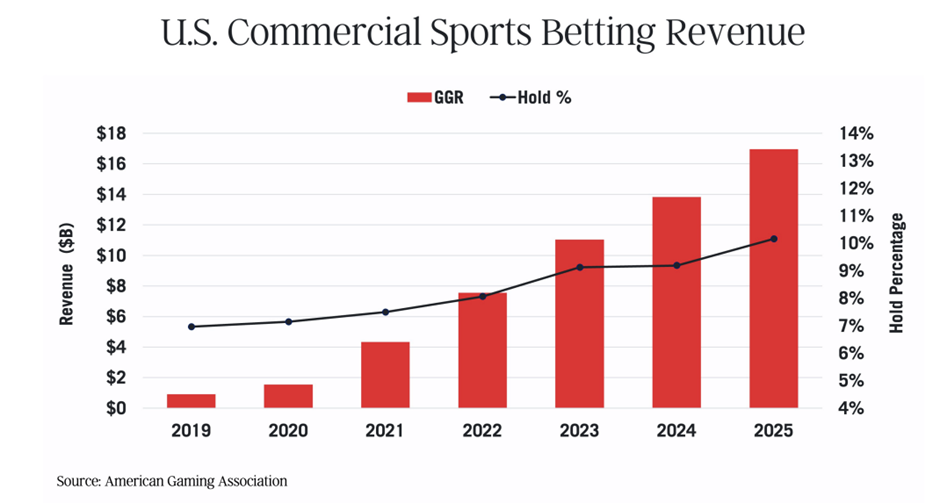 In 2018, the US Supreme Court struck down PASPA (Professional and Amateur Sports Protection Act of 1992), handing over sports betting regulations to be set by individual states, marking the start of the betting boom in the US. To date, 38 states allow sports betting; of those, 30 allow online sports betting. Revenues from sports betting have grown massively from just shy of $1B in 2019 to over $16B in 2025, showing a 60% CAGR.